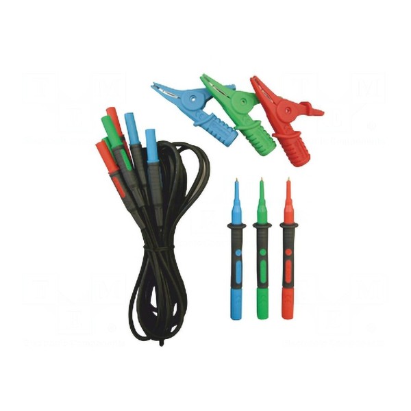 W zestawie: końcówki pomiarowe x3, krokodylki x3, przewody pomiarowe x3.