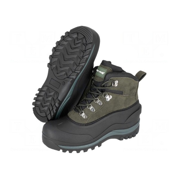 Obuwie typu śniegowce marki LAHTI PRO wykonane zostało z połączenia skóry syntetycznej oraz tworzywa TPR. Model w rozmiarze 43 utrzymany jest w ciemnozielonej kolorystyce.