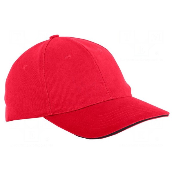 Czapka z daszkiem została wykonana z bawełny o gramaturze 290g/m². Produkt występuje w czerwonym kolorze i posiada zakres regulacji rozmiaru 57-61.