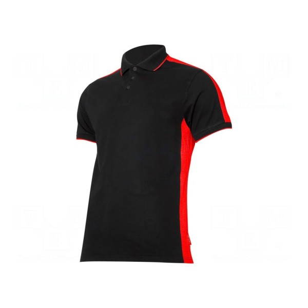 Koszulka polo wykonana z bawełny o gramaturze 190g/m². Produkt dostępny w rozmiarze L oraz kolorystyce czarno-czerwonej.
