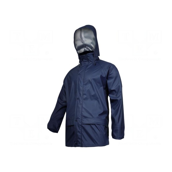 Kurtka przeciwdeszczowa marki LAHTI PRO wykonana została z poliuretanu w kolorze granatowym. Model dostępny jest w rozmiarze XL i wyposażony w kaptur, co zwiększa ochronę przed opadami atmosferycznymi.