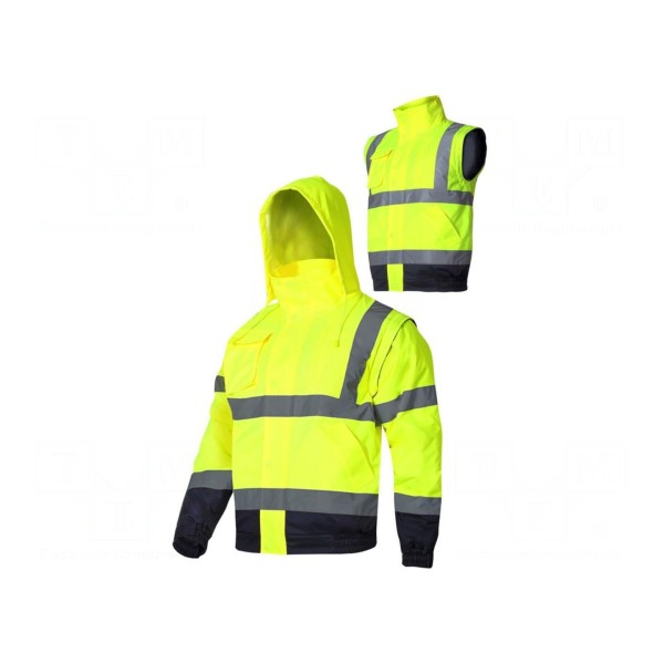 Kurtka robocza w kolorze żółtym została wykonana z poliestru 300D o gramaturze 180g/m². Model posiada właściwości ostrzegawcze i jest przeznaczony dla użytkowników wymagających rozmiaru XXXL.