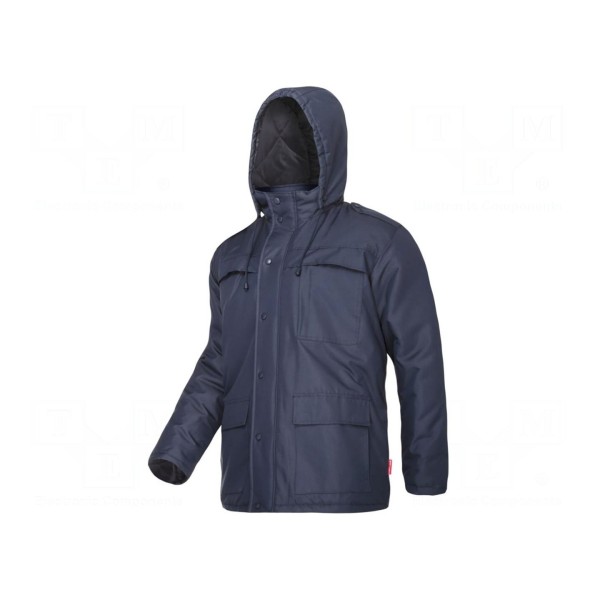 Kurtka robocza wykonana z poliestru 300D o gramaturze 140g/m² stanowi element odzieży ochronnej. Model w kolorze granatowym posiada zintegrowany kaptur, co zwiększa osłonę przed niekorzystnymi warunkami zewnętrznymi.
