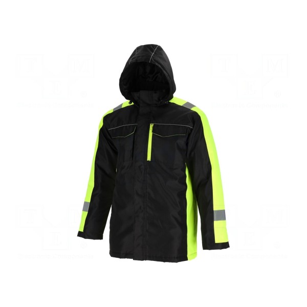Kurtka robocza wykonana została z poliestru 300D o gramaturze 180g/m². Produkt dostępny jest w kolorystyce czarno-żółtej i występuje w rozmiarze XXXL.