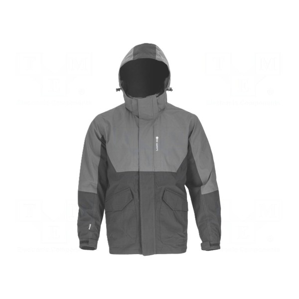 Kurtka robocza LAHTI PRO wykonana jest z połączenia poliestru oraz tworzywa TPU, co zapewnia właściwości wodoodporne. Model o gramaturze 150g/m² dostępny jest w rozmiarze S, dedykowanym dla osób o wzroście 173 cm oraz obwodzie klatki piersiowej 90-96 cm. Produkt występuje w kolorystyce czarno-szarej.