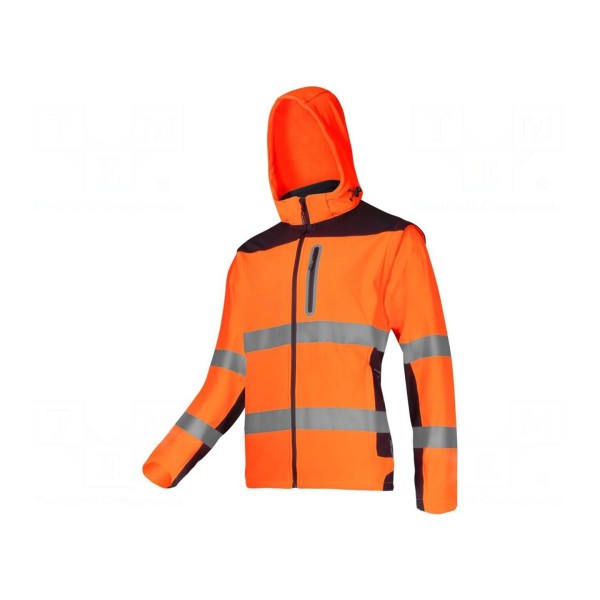 Kurtka soft-shell ostrzegawcza w kolorze pomarańczowym została wykonana z poliestru o gramaturze 320g/m². Model ten w rozmiarze XXXL posiada funkcjonalne odpinane rękawy, co pozwala na dostosowanie odzieży do panujących warunków atmosferycznych.