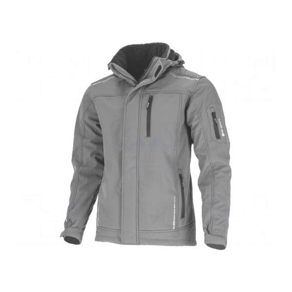 Kurtka soft-shell w kolorze szarym wykonana została z poliestru o gramaturze 380g/m². Model w rozmiarze S (173/90-96) posiada ocieplaną konstrukcję oraz zintegrowany kaptur.