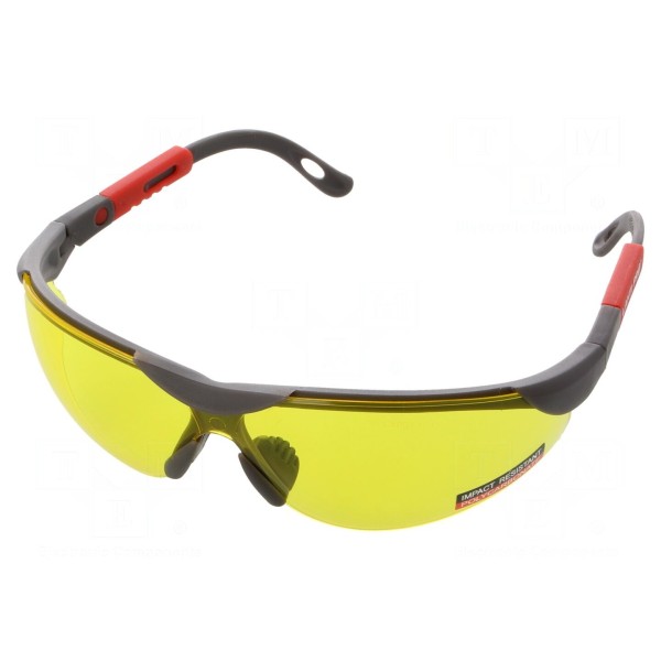 Okulary ochronne z żółtymi soczewkami zapewniają ochronę przed cząstkami stałymi oraz promieniowaniem UV. Konstrukcja modelu umożliwia regulację, co pozwala na dopasowanie elementu do użytkownika.