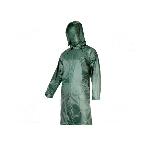 Płaszcz przeciwdeszczowy wykonany z połączenia poliestru oraz PVC zapewnia ochronę przed opadami atmosferycznymi. Model w rozmiarze L został wykończony w zielonym kolorze i wyposażony w zintegrowany kaptur.