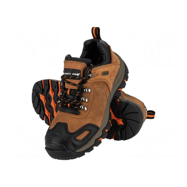 Obuwie typu półbuty o rozmiarze 40 wykonane zostało ze skóry w kolorze brązowym. Model został zaprojektowany z myślą o zapewnieniu ochrony przed niepogodą oraz poślizgiem na powierzchniach użytkowych.