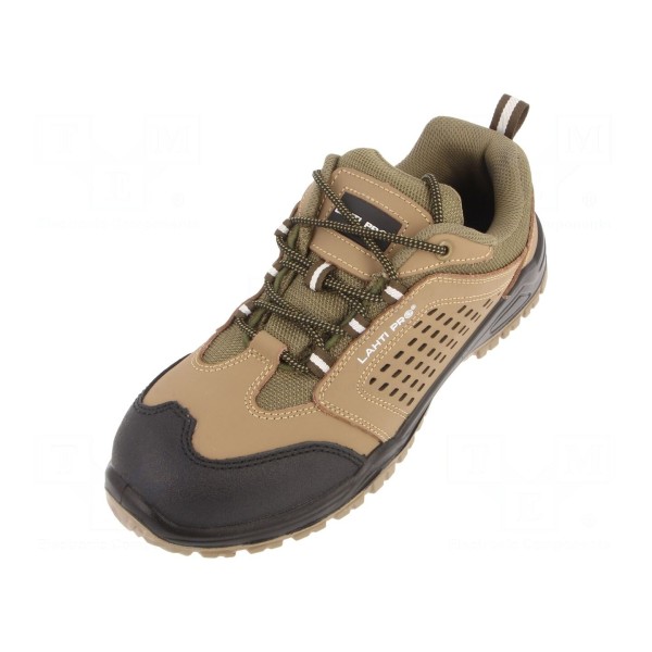 Półbuty LAHTI PRO w rozmiarze 42 zostały wykonane ze skóry w kolorystyce beżowo-czarnej. Konstrukcja obuwia obejmuje metalowy podnosek oraz praktyczne otwory, które poprawiają wentylację stopy podczas użytkowania.
