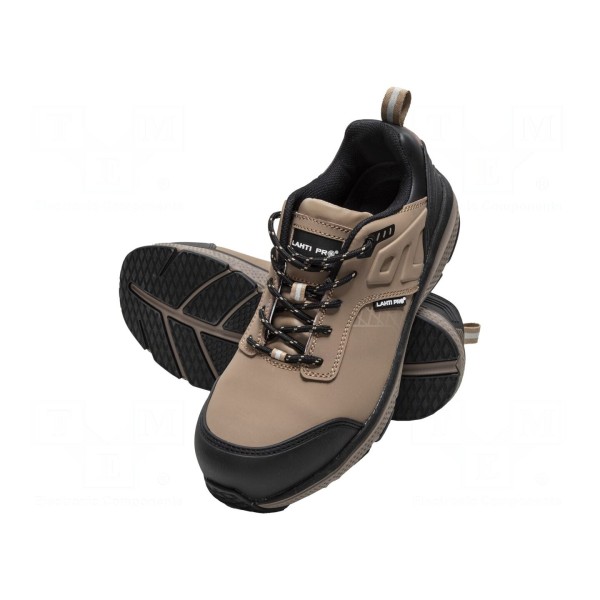 Półbuty marki LAHTI PRO w rozmiarze 42 wykonane zostały z nubuku w kolorystyce beżowo-czarnej. Obuwie wyposażono w podnosek kompozytowy, który zwiększa bezpieczeństwo użytkownika w miejscu pracy. Produkt spełnia wymagania kategorii bezpieczeństwa S3 SRC.