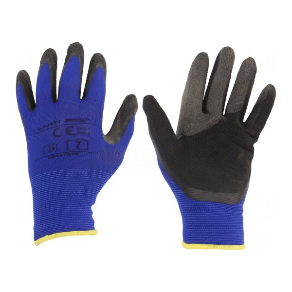 Rękawice ochronne zostały wykonane z połączenia lateksu oraz poliamidu, co zapewnia ich strukturę i trwałość. Produkt występuje w rozmiarze 7 oraz w kolorystyce czarno-granatowej.
