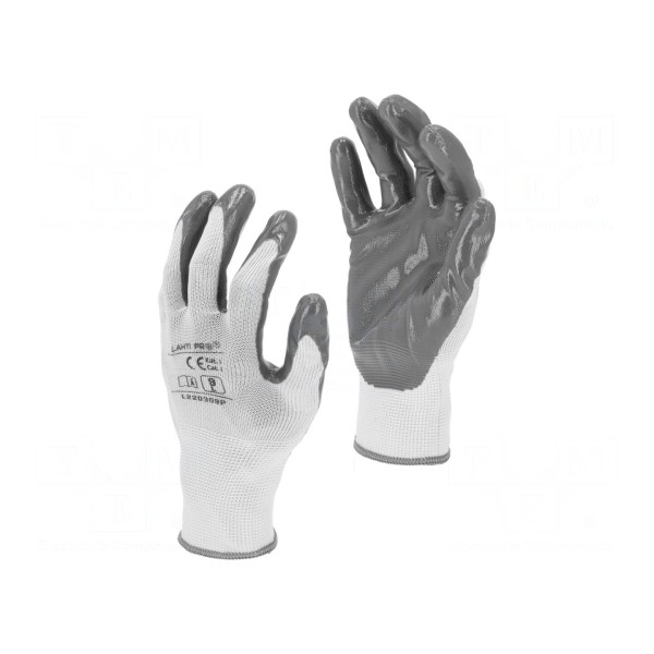 Rękawice ochronne LAHTI PRO wykonane zostały z połączenia bawełny oraz nitrylu, co zapewnia odpowiednią charakterystykę materiałową dla tego typu osłony dłoni. Produkt dostępny jest w rozmiarze 8 i utrzymany w kolorystyce szaro-białej.