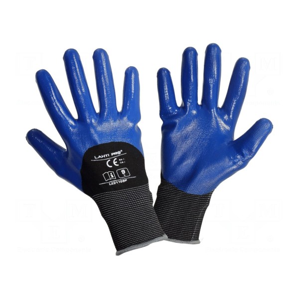 Rękawice ochronne LAHTI PRO wykonane są z połączenia poliestru oraz powłoki nitrylowej. Produkt dostępny jest w rozmiarze 10 i charakteryzuje się czarno-fioletową kolorystyką.