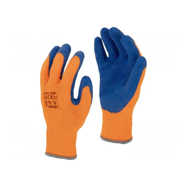 Rękawice ochronne w rozmiarze 9 zostały wykonane z połączenia akrylu oraz lateksu. Model w kolorze pomarańczowym posiada ocieplaną konstrukcję, co umożliwia użytkowanie w niższych temperaturach.