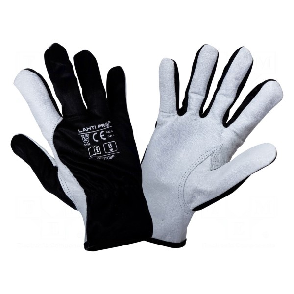 Rękawice ochronne w rozmiarze 8 wykonane zostały z połączenia poliestru, skóry naturalnej oraz tkaniny nylonowej. Produkt utrzymany jest w kolorze czarnym.