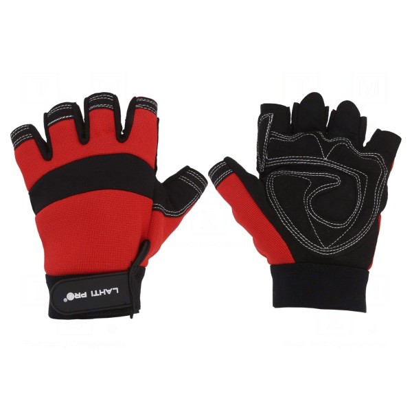 Rękawice ochronne LAHTI PRO wykonane zostały z połączenia mikrofibry oraz plastiku. Model ten charakteryzuje się wersją bez palców oraz kolorystyką czarno-czerwoną.