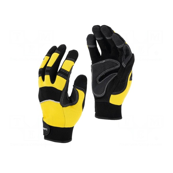 Rękawice ochronne w rozmiarze 10 charakteryzują się konstrukcją wykonaną z połączenia elastanu, poliamidu, poliestru, PU, PVC oraz tkaniny nylonowej. Produkt utrzymany jest w kolorystyce czarno-żółtej.