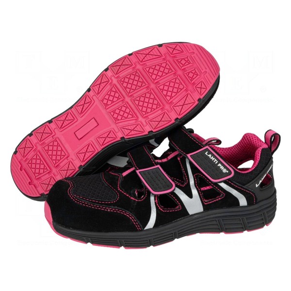 Konstrukcja wykonana została z połączenia dzianiny oraz zamszu w kolorystyce czarno-różowej. Produkt jest zgodny z normami CE oraz EN ISO 20345:2011.