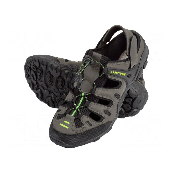 Sandały ochronne w rozmiarze 39 charakteryzują się konstrukcją wykonaną z połączenia dzianiny oraz poliuretanu (PU). Model dostępny jest w kolorystyce szaro-czarnej.