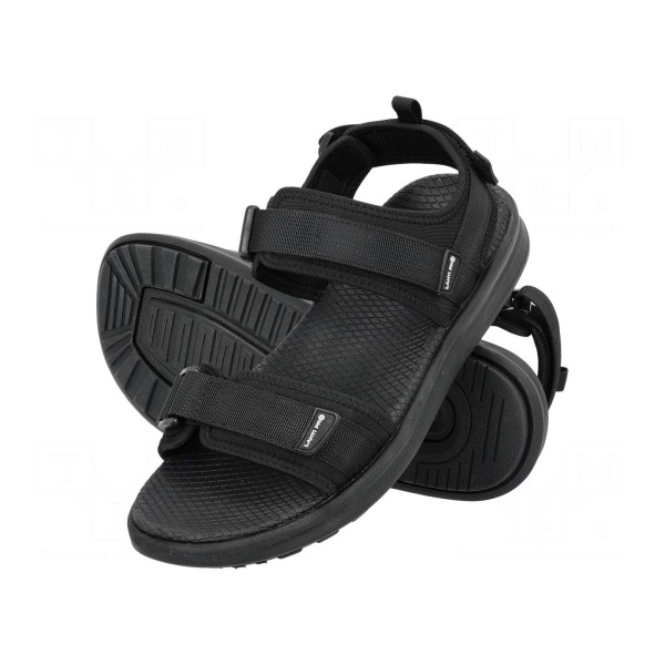 Sandały marki Lahti Pro wykonane zostały z dzianiny w kolorze czarnym. Model ten występuje w rozmiarze 44.