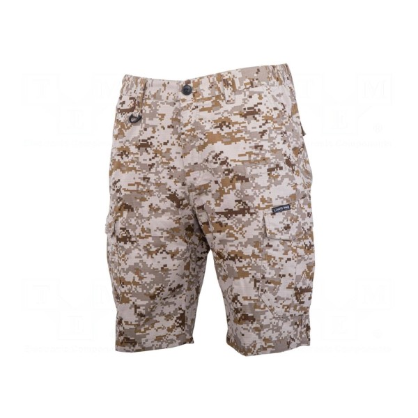 Spodenki ochronne wykonane z połączenia bawełny oraz poliestru charakteryzują się gramaturą materiału na poziomie 220g/m². Produkt dostępny jest w wersji krótkiej o kroju typu slim-fit, wykończonej w kolorystyce beżowo-moro.