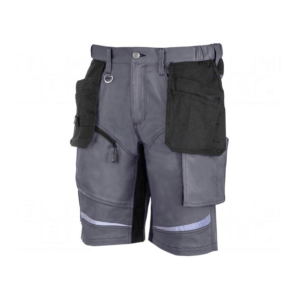 Spodenki ochronne wykonane są z mieszanki bawełny oraz elastanu o gramaturze 270g/m². Model w kolorze szaro-czarnym charakteryzuje się krojem slim-fit oraz krótkimi nogawkami, co zapewnia dopasowanie do sylwetki w rozmiarze XXXL.