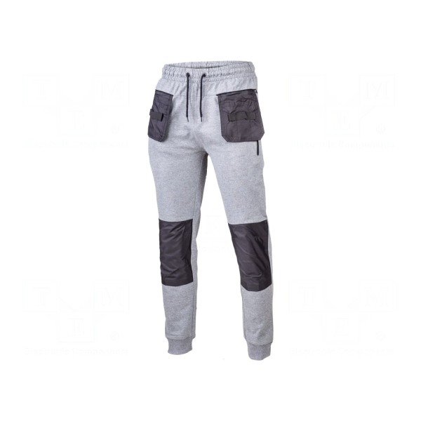 Spodnie dresowe w rozmiarze XL wykonane są z mieszanki materiałów obejmującej bawełnę, poliester oraz elastan. Materiał charakteryzuje się gramaturą 320g/m² i utrzymany jest w kolorystyce szaro-czarnej.