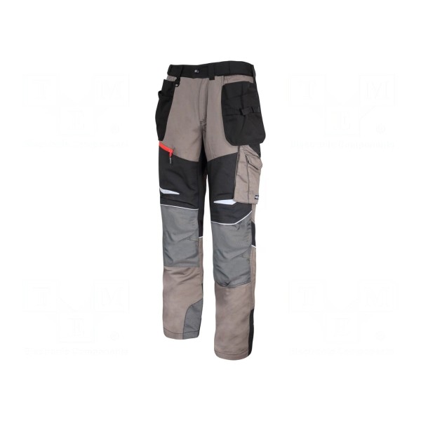 Spodnie robocze wykonane zostały z połączenia bawełny oraz poliestru o gramaturze 270g/m². Model charakteryzuje się krojem typu slim-fit oraz dostępny jest w kolorystyce czarnej z akcentami khaki.