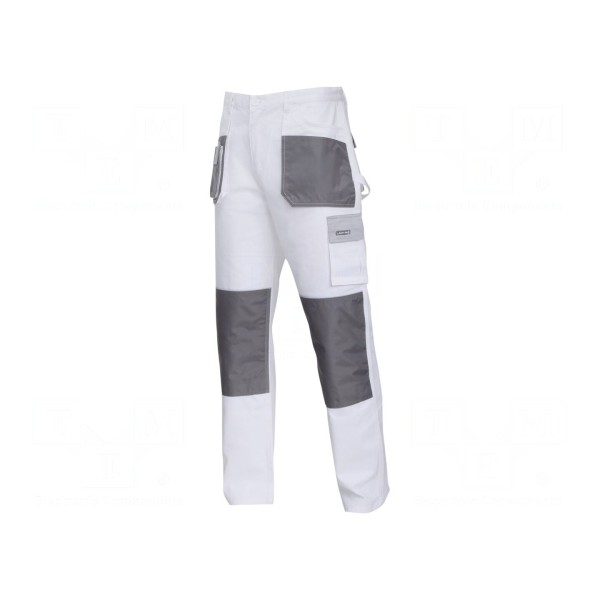 Spodnie robocze wykonane z bawełny o gramaturze 240g/m² przeznaczone są do prac wymagających odzieży ochronnej. Model w kolorystyce biało-szarej charakteryzuje się dostępnością dziewięciu kieszeni, które umożliwiają organizację drobnych narzędzi lub akcesoriów podczas wykonywania czynności zawodowych.