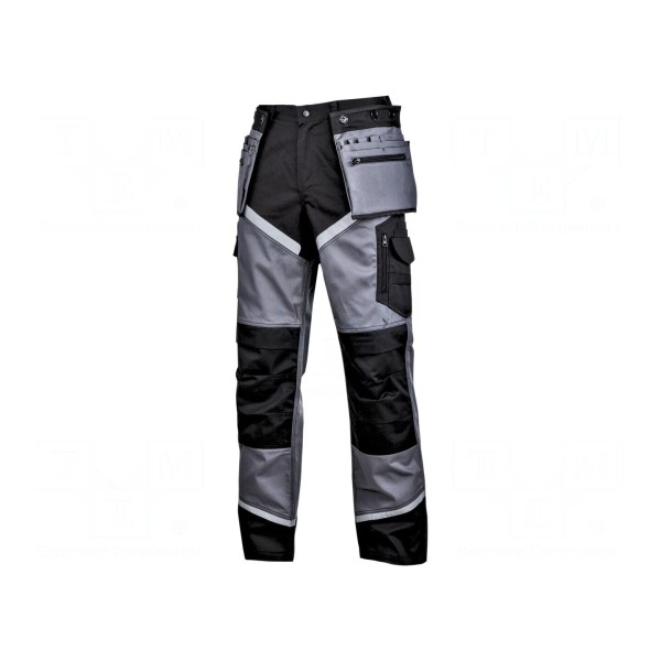 Spodnie robocze wykonane zostały z połączenia bawełny oraz poliestru o gramaturze 270g/m². Produkt dostępny jest w kolorystyce czarno-szarej i rozmiarze L.