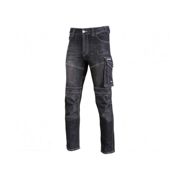 Spodnie robocze w kolorze czarnym wykonane zostały z połączenia bawełny, poliestru, elastanu oraz jeansu. Model o kroju slim-fit posiada gramaturę materiału wynoszącą 340g/m².