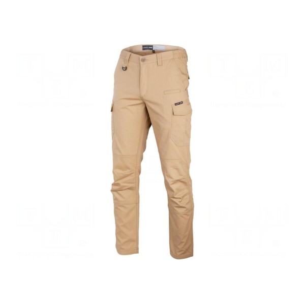 Spodnie robocze typu bojówki wykonano z mieszanki bawełny oraz poliestru o gramaturze 220g/m². Produkt charakteryzuje się krojem slim-fit oraz beżową kolorystyką, zapewniając dopasowanie do sylwetki podczas wykonywania prac fizycznych.