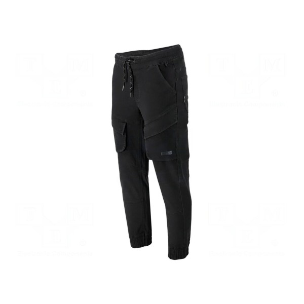 Spodnie robocze w kroju jogger wykonane zostały z połączenia bawełny, poliestru oraz elastanu. Model charakteryzuje się gramaturą materiału wynoszącą 415g/m² oraz czarną kolorystyką.