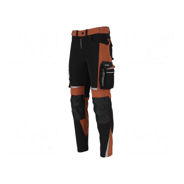 Spodnie robocze w rozmiarze XL charakteryzują się krojem typu slim-fit oraz kolorystyką brązowo-czarną. Wykonane zostały z połączenia tkaniny nylonowej oraz elastanu o gramaturze 240g/m², co zapewnia dopasowanie do sylwetki podczas wykonywania pracy.