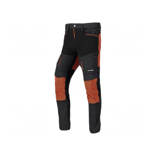 Spodnie robocze wykonane z mieszanki bawełny oraz poliestru charakteryzują się gramaturą materiału 240g/m². Produkt dostępny jest w rozmiarze L oraz w kolorystyce czarno-pomarańczowej.
