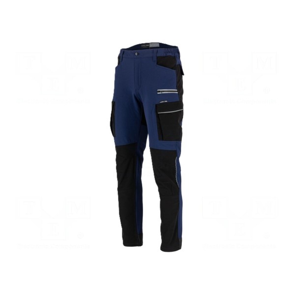 Spodnie robocze wykonane z połączenia elastanu oraz nylonu o gramaturze 240g/m². Model w kroju slim-fit charakteryzuje się granatowo-czarną kolorystyką i jest zgodny z normą CE.