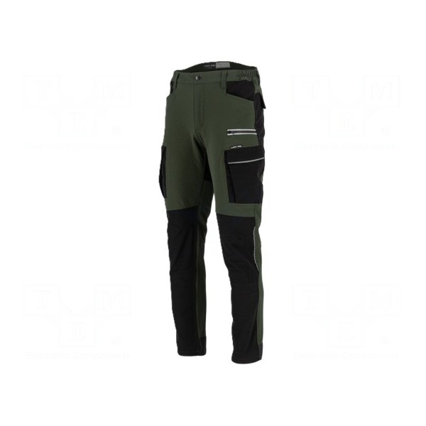Konstrukcja spodni typu slim-fit została wyposażona w 8 kieszeni oraz pasy odblaskowe zwiększające widoczność. Zastosowany materiał z serii STRETCH zapewnia elastyczność użytkowania w kolorystyce zielono-czarnej.