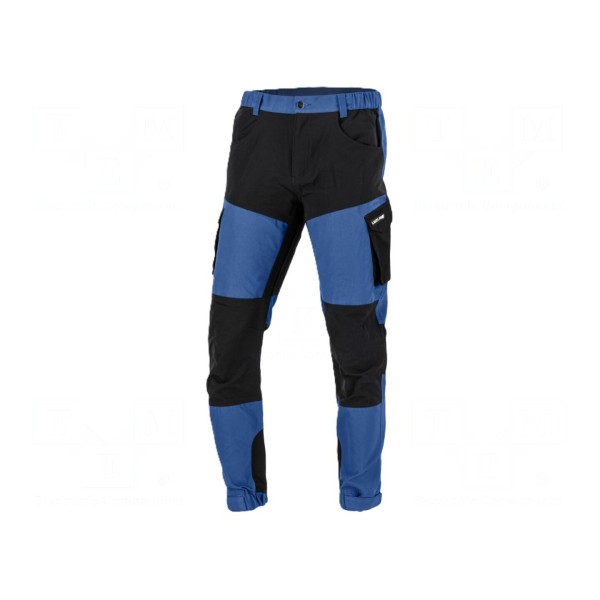 Spodnie robocze wykonane z połączenia bawełny, elastanu, nylonu oraz poliestru charakteryzują się gramaturą materiału 240g/m². Produkt utrzymany jest w kolorystyce niebiesko-czarnej i przeznaczony dla użytkowników o rozmiarze L (wzrost 179 cm, obwód w pasie 92-98 cm).
