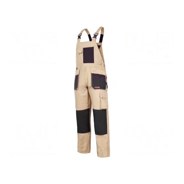 Spodnie ogrodniczki wykonane z bawełny o gramaturze 270g/m² przeznaczone są do prac wymagających odzieży ochronnej. Model w kolorze beżowym posiada dziesięć kieszeni, co pozwala na organizację narzędzi i akcesoriów niezbędnych podczas wykonywania zadań.