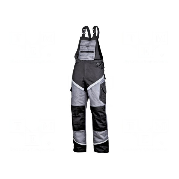 Spodnie robocze typu ogrodniczki wykonane zostały z połączenia bawełny oraz poliestru o gramaturze 270g/m². Produkt charakteryzuje się czarno-szarą kolorystyką oraz konstrukcją wyposażoną w 18 kieszeni, co zwiększa funkcjonalność podczas pracy.