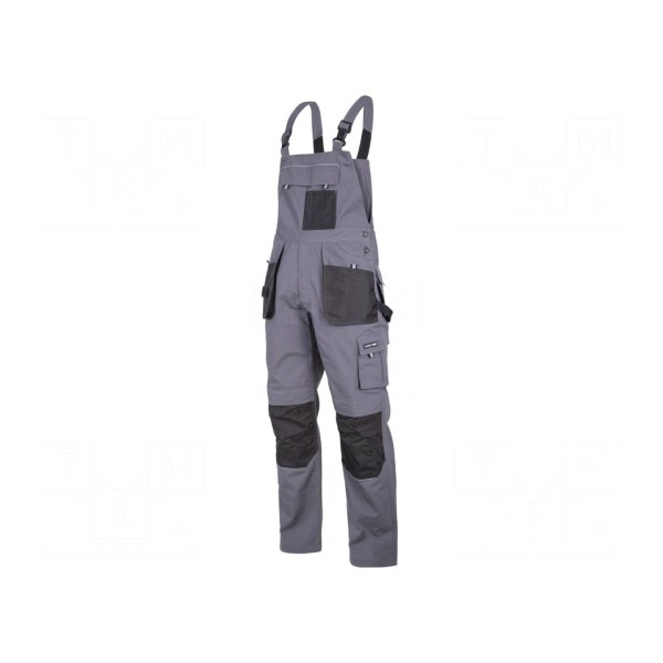Spodnie robocze typu ogrodniczki wykonane zostały z mieszanki bawełny oraz poliestru. Materiał o gramaturze 265g/m² zapewnia trwałość podczas codziennej pracy. Produkt posiada oznaczenie rozmiaru 52 w formacie L.