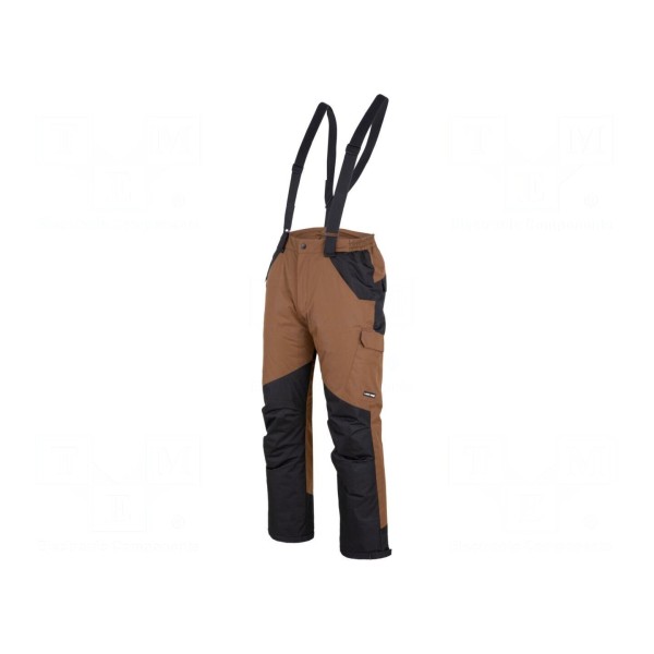 Spodnie robocze marki LAHTI PRO wykonane zostały z poliestru o gramaturze 200g/m². Model w kolorze brązowo-czarnym występuje w wersji na szelkach oraz posiada ocieplenie, co pozwala na użytkowanie w niższych temperaturach.