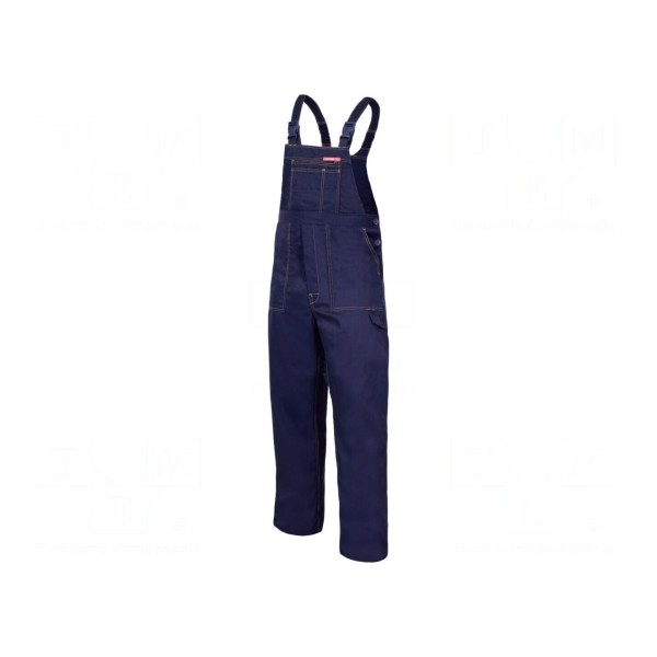 Spodnie robocze typu ogrodniczki ochronne QUEST dostępne są w rozmiarze XL, odpowiednim dla osób o wzroście 176 cm oraz obwodzie klatki piersiowej 98–102 cm. Produkt wykonany jest w kolorze granatowym.