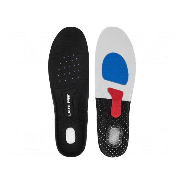 Wkładki do butów LAHTI PRO w wersji sportowej zostały wykonane z połączenia lateksu, tkaniny poliestrowej oraz materiału TPR. Produkt charakteryzuje się grubością 4 mm, co pozwala na dopasowanie do obuwia w rozmiarze 44.