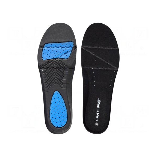 Wkładki do obuwia wykonane z połączenia lateksu oraz tkaniny poliestrowej. Element przeznaczony do rozmiaru stopy 46, o grubości profilu wynoszącej 4,5 mm.