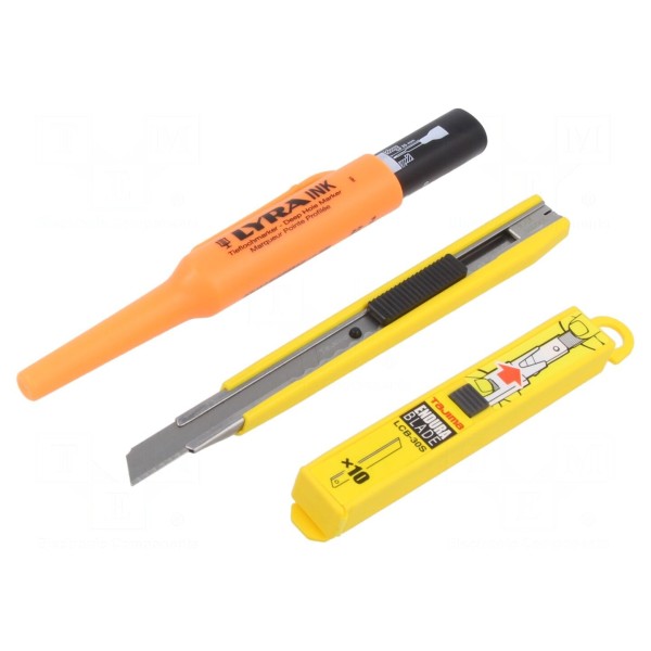 W zestawie: nóż, ostrza do noża x9, pisak.