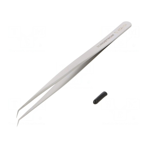 Pęseta o długości 140 mm została wykonana ze stali nierdzewnej. Narzędzie posiada ostre, zagięte końcówki oraz gładkie powierzchnie chwytające, co umożliwia operowanie drobnymi elementami.