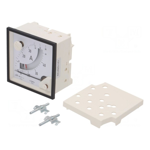 Amperomierz analogowy przeznaczony jest do pomiaru prądu przemiennego AC w zakresie od 0 do 40 A. Urządzenie realizuje pomiar pośredni z wykorzystaniem przekładnika prądowego 5 A oraz umożliwia odczyt prądu chwilowego. Miernik dodatkowo wskazuje najwyższą osiągniętą wartość prądu oraz wyznacza średni pomiar RMS co 8 minut. Maksymalne napięcie pracy dla przyrządu wynosi 300 V, a dopuszczalna przeciążalność elektryczna sięga 48 A.